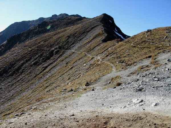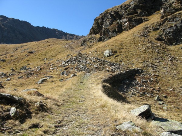 Am nächsten Morgen dann auf zur zweiten Etappe. Ich hatte mich am Abend dazu entschieden aus den 6 Tagen eine viertägige Transalp zu machen. Schließlich musste ich ja bergauf kein Mountainbike schieben. War ich doch nur mit einem zweieinhalb Kilogramm leichten Rucksack unterwegs. Da war alles drin, von der Zahnbürste über eine Hose, T-Shirt und Jacke fürs Abendessen. Auch Ersatz Laufkleidung hatte noch Platz und meinen Fotoapparat. Ansonsten nur noch ein paar Riegel... das wars dann schon. Jedenfalls hatte ich vor, wie am ersten Tag eineinhalb Etappen zu laufen. Am zweiten Tag war das dann schon schwerer, da die Beine nicht mehr ganz frisch waren. Und es waren zwei harte Anstiege zu überwinden. Zuerst aufs Pinnisjoch auf wieder über 2300 Meter sowie nach einem Abstieg ins Gschnitztal rauf auf die Pferscher Scharte wiederum ein Anstieg von 1200 Höhenmetern. Allerdings sollte es anders kommen. Ich hab mich an der österreichischen Tribulaunhütte, die schon geschlossen hatte, nicht gescheit orientiert und bin aus Versehen zur Schneetalscharte hochgelaufen. Das war ein grober Fehler, denn der Weg dorthin war einfach kaum zu bewältigen. Steil über loses Geröll nach oben, immer am Rande des Wahnsinns. Und dann war da noch die Abzweigung zum Gschnitzer Tribulaun. Da bin ich dann hoch gerannt, weil ich annahm, dass ich von dort schon zur Pferscher Scharte absteigen könne. Doch weit gefehlt, der Gipfel auf über 3000 m war eine Sackgasse!! Tia, dann halt wieder runter und doch über die gefährliche Schneetalscharte runter ins Pferscher Tal. Als ich über der Scharte war hab ich ein Kreuzzeichen gemacht. War es doch schon arg spät geworden. Und jetzt noch 1550 Höhenmeter ins Tal. Doch es war ein Traum. Eine alte Militärstrasse. Inzwischen mit Gras überwachsen. Da lief es sich so wunderbar. Ja und dann war ich endlich unten im Tal. Da gab es nur ein Hotel. Doch das war 4* Qualität. Sehr persönliche Betreuung und vor allem eine super Küche. Da waren die Wunden schnell geleckt. Nach 34 Kilometer und 3200 Höhenmetern war es aber sehr schwer guten Schlaf zu finden.